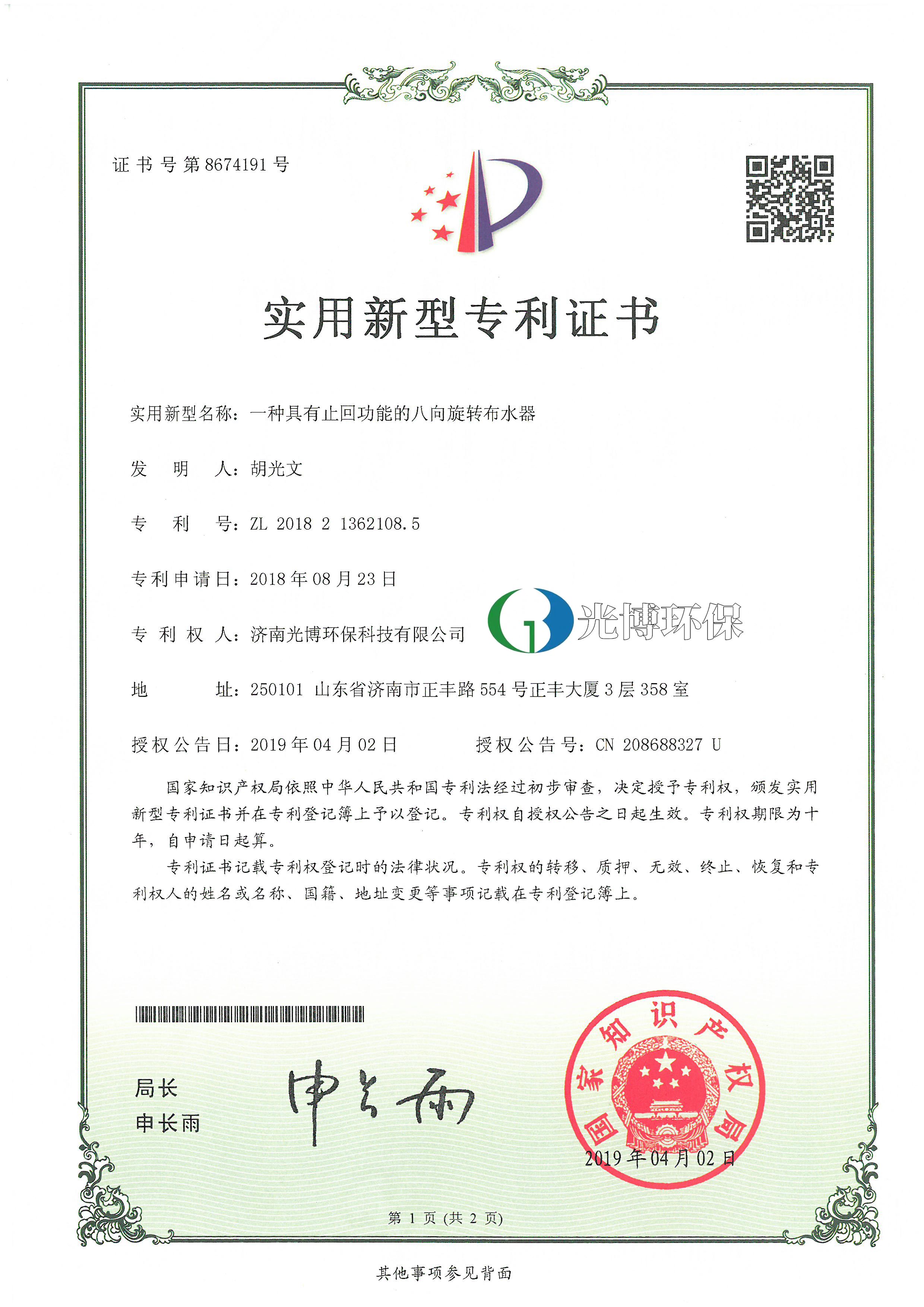实用新型专利证书-止回功能的八向旋转布水器