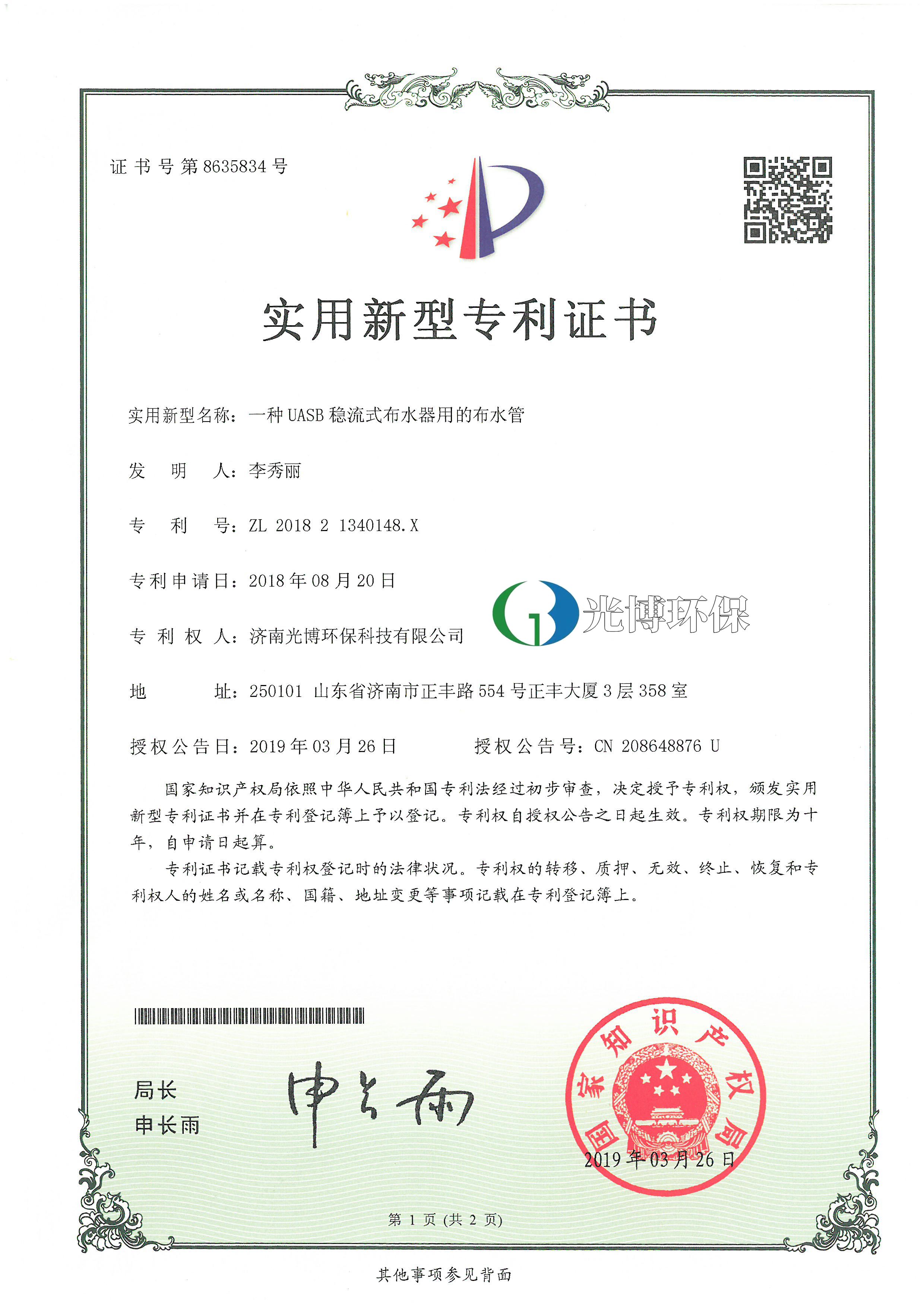 实用新型专利证书-UASB稳流式布水器用的布水管