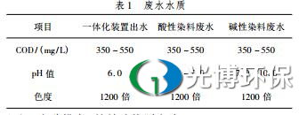 污水来源及水质本研究的染料污水来源于某家印染厂,该厂排放的污水含有大量的偶氮染料酸性红,偶氮染料是印染工艺中最广泛的一类合成染料,用于多种天然和合成纤维的染色和印花,也用于油漆、塑料、橡胶等的着色。在特殊条件下,它能分解产生20多种致癌芳香胺,经过活化作用改变人体的DNA结构引起病变和诱发癌症。该印染厂区生产排放的污水进入 污水站,经初步混凝和生化沉淀一体化装置处理后,取一体化装置出水按一定比例投加酸(盐酸)、碱(氢氧化钠)均匀混合成不同pH值范围内的污水,具体水质见表1。