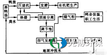 鸭场采用清洁生产工艺,每天排放的鸭粪人工清除至干鸭粪池,堆沤发酵后作为农田有机肥。每天处理排放的冲洗污水由污水沟汇集于集水池中,经过机械格栅初步固液分离,分离出的粪渣并入收集的干粪中,作有机肥料;经分离后的污水进入调节池进行调节水质水量,使后续的沼气发酵单元稳定运作。沼气池的沼液储存用于生态鱼塘的鱼饲料,同时生态鱼塘的水部分可以用于冲洗鸭舍。养鸭场所清的干鸭粪及固液分离出来的污泥发酵用于有机肥的生产。基本达到了循环使用,生态养殖的目的。
