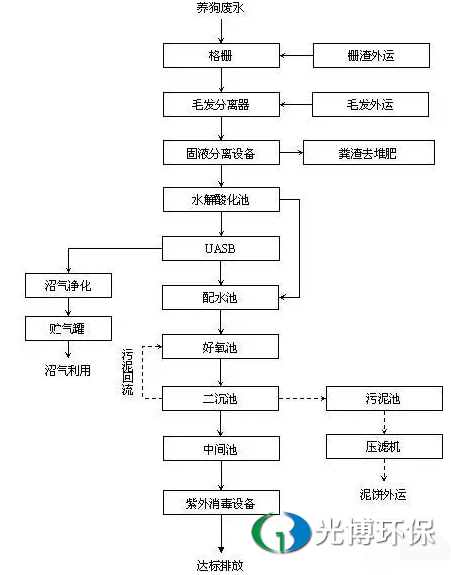 基于以上原因,针对养狗污水的特点,并参考国内多数养殖场的污水处理站,设计的处理工艺为: