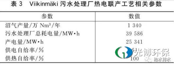 该厂的工艺亮点是通过热电联产设备回收电能和热能。该厂污泥厌氧消化产生的沼气年产量为1340万Nm3,目前产生的电力可以满足该厂电力需求的70%,2017年的目标是提高至80%(见表3)。目前,产生的热量可以满足污水处理厂自身需要。