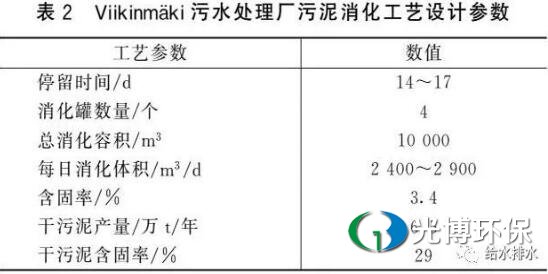 污泥处理采用中温厌氧消化工艺,消化温度为36~37℃,工艺设计参数见表2。消化后的污泥运送到堆肥厂,与泥炭、树皮等以1∶1的比例进行混合,混合后堆积6个月,之后加入砂和矿物(黑云母),最后经过20mm孔径的筛网,经过筛网的成品可用作园艺土或者绿色建筑的辅助材料。在堆肥过程中,每年可回收约磷580t和氮620t。