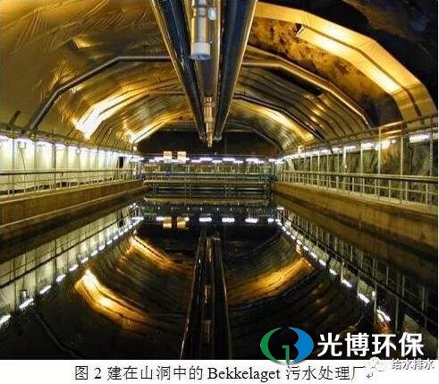 该污水处理厂是一座建在山洞中的污水处理厂(见图2),位于挪威首都奥斯陆的南边奥斯陆峡湾边,是挪威的第二大污水处理厂。该厂于1998年开始建设,2000年9月投入运行,日均处理量为10万m3/d,处理污水量占整个奥斯陆地区的35%~40%,服务人口约28万人。