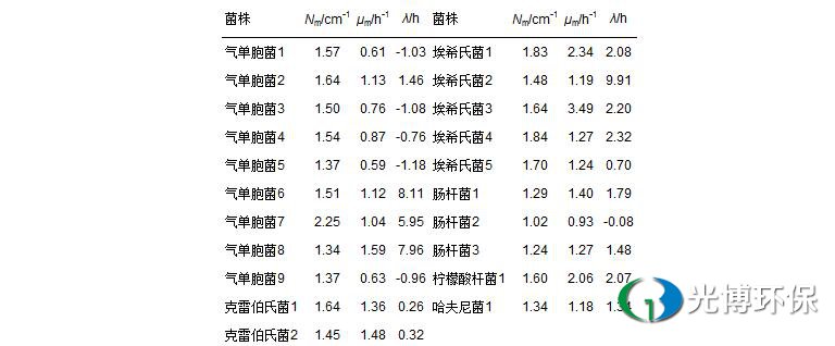 2)21株四环素抗性菌中,气单胞菌、埃希氏菌的平均最大生长量显著高于肠杆菌.四环素抗性菌的最大比生长速率在0.6~2.3 h-1之间,气单胞菌的最大比生长速率显著低于埃希氏菌和柠檬酸杆菌.大部分菌株的迟滞时间在2 h以内,各菌属间无显著差别.