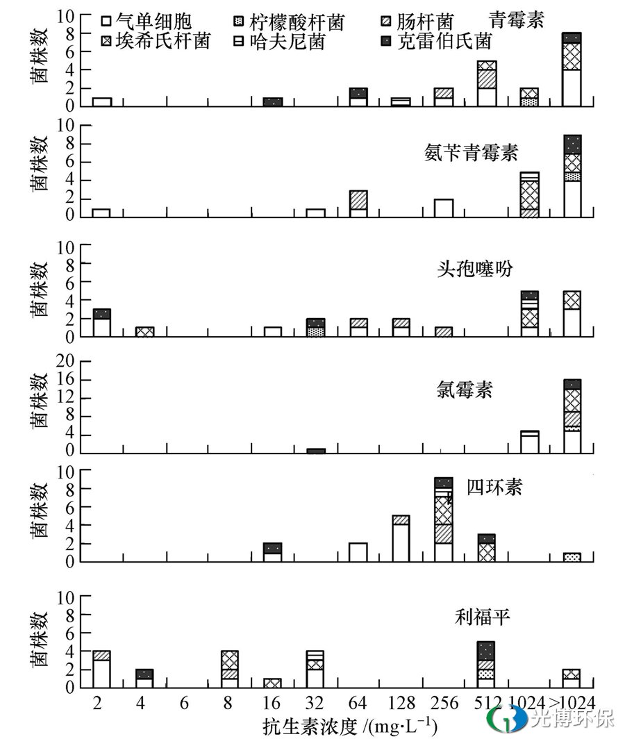 根据美国临床和实验室标准协会(CLSI)抗生素试验标准,青霉素、氨苄青霉素、头孢噻吩、氯霉素、四环素和利福平对典型病原菌的最小抑制浓度界定(抗性界定)最大值MICd分别为16、32、32、32、16、4 mg · L-1.
