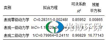 比较各级动力学的相关系数R2知TOC去除更符合表观二级动力学,化学反应速率常数为1.25746×10-4 L · mg-1 · min-1,与反应物浓度的二次方成正比.
