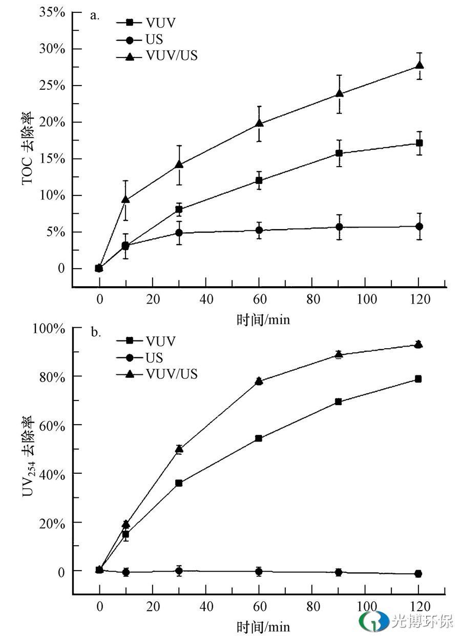 由图 3可见,反应120 min,VUV、US和VUV/US对TOC的去除率分别为17.13%、5.75%、27.68%.VUV/US的处理效果明显高于VUV和US的情况.由图 3b可见,反应120 min,VUV、US及VUV/US对UV254的去除率分别为78.83%、-1.53%、93.03%.VUV/US的处理效果明显好于VUV和US的情况.单独US处理后,UV254去除率为负值,表明水中UV254增加,可能是水中少量悬浮物在US作用下溶解,致使水中UV254增加,而且US对UV254的去除率本身就很低.