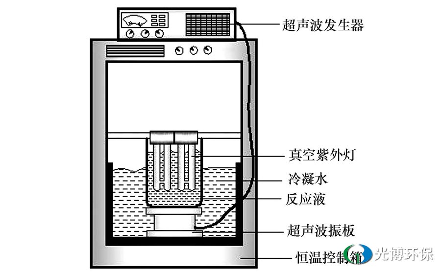 VUV/US耦合反应装置示意图如图 1所示.超声波频率为600 kHz,功率为100 W,声能密度约为2 W · cm-2;真空紫外灯功率8 W ·根-1,灯长9.5 cm,发射185+254 nm紫外光,其中,185 nm的VUV占12%~15%.真空紫外灯完全浸没于玻璃烧杯水溶液中并固定,玻璃烧杯置于超声波振子上,装置置于恒温控制箱控制反应温度.